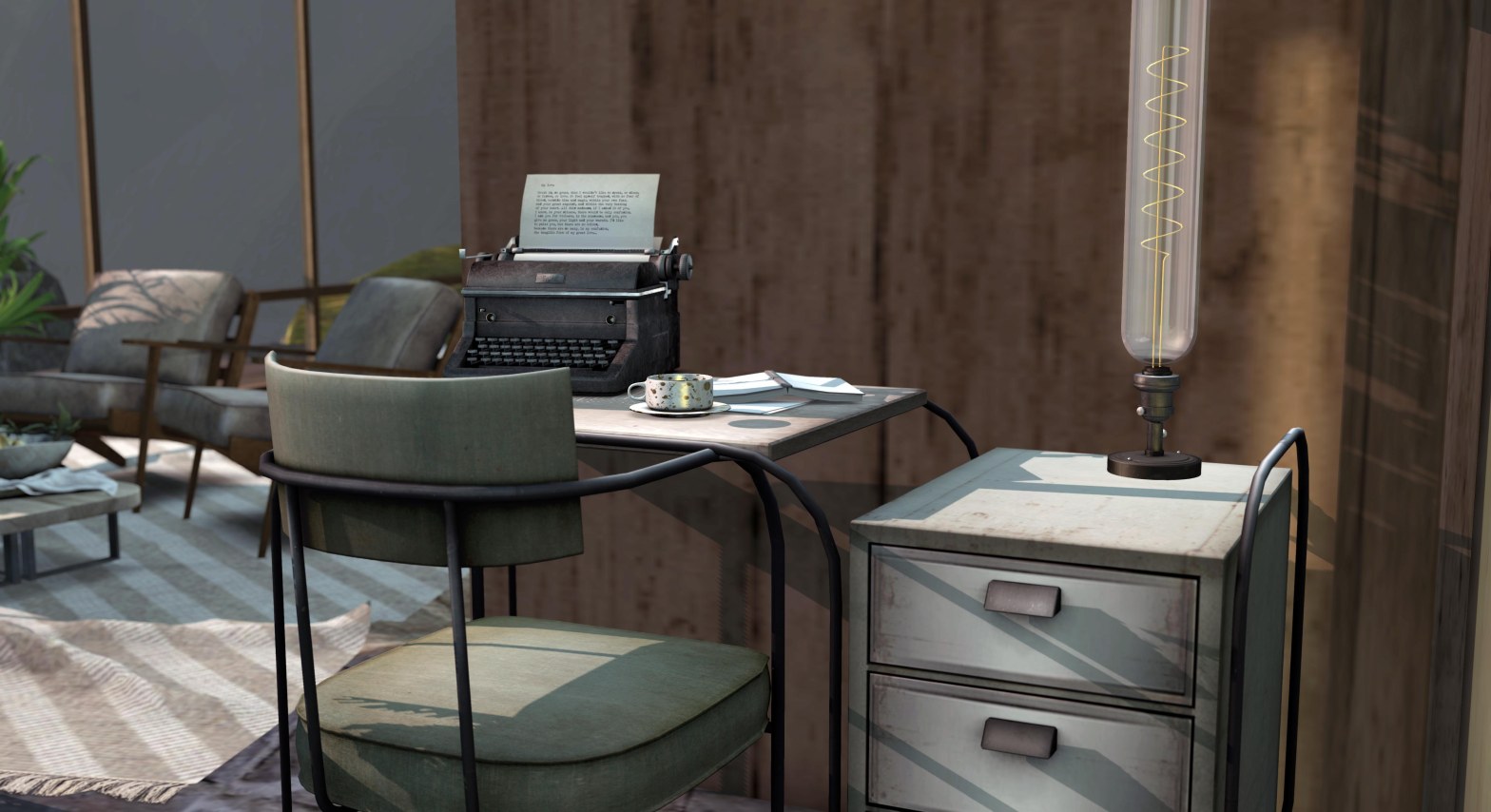 Landscape: Elvira Kytori House: Catskills Lodge 0.2 – Scarlet Creative Study Office Desk – Hideki Seven Secrets – Keke Eagan Coffee Cup – Fancy Decor Slim Bulb Lamp in Onyx – Keke